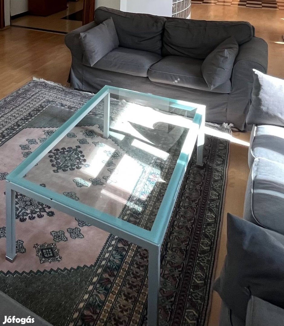 Eladó zöldes szürke színű fémvázas üveg dohányzó asztalr