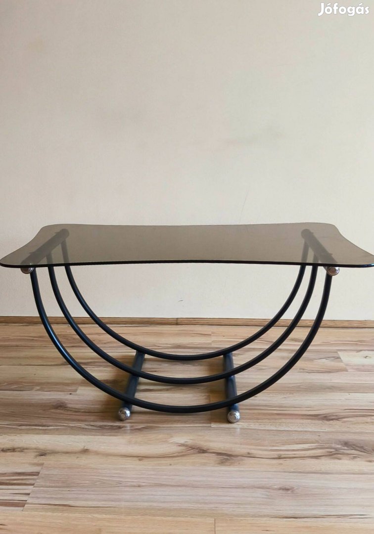 Egyedi kialakítású dohányzó asztal, fém félkörben hajlított lábakon, pogácsa alakú edzett üveg, sötét barna színben. Az asztal stabil, a két merőleges lábnak köszönhetően stabilan áll. Az üveglap műanyag tappancsokkal rögzül a lábakhoz.