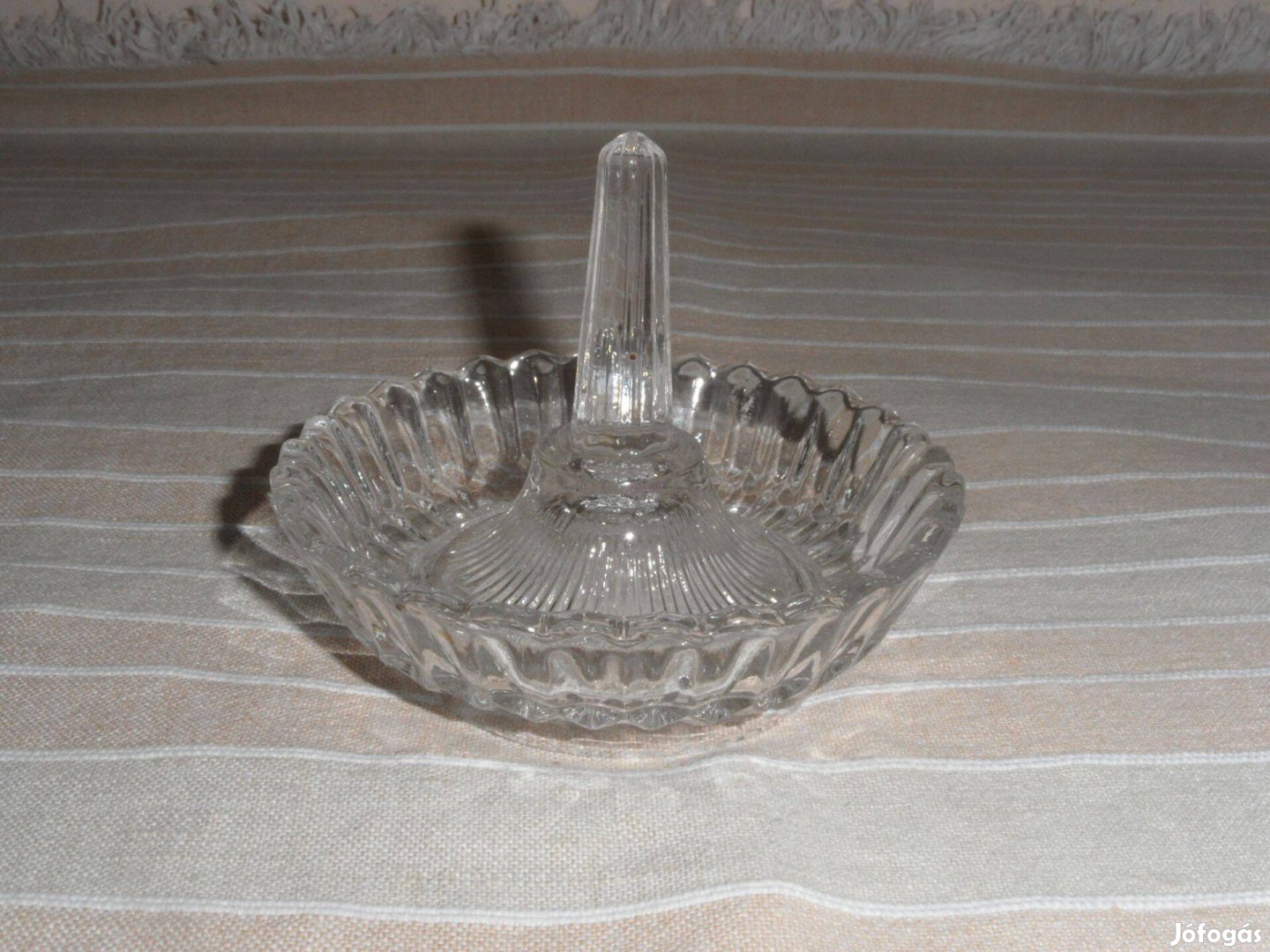 A képen látható üveg gyűrűtartó eladó. Peremén gyártási hiba van ( lásd fotó ), amely a használatot nem befolyásolja.