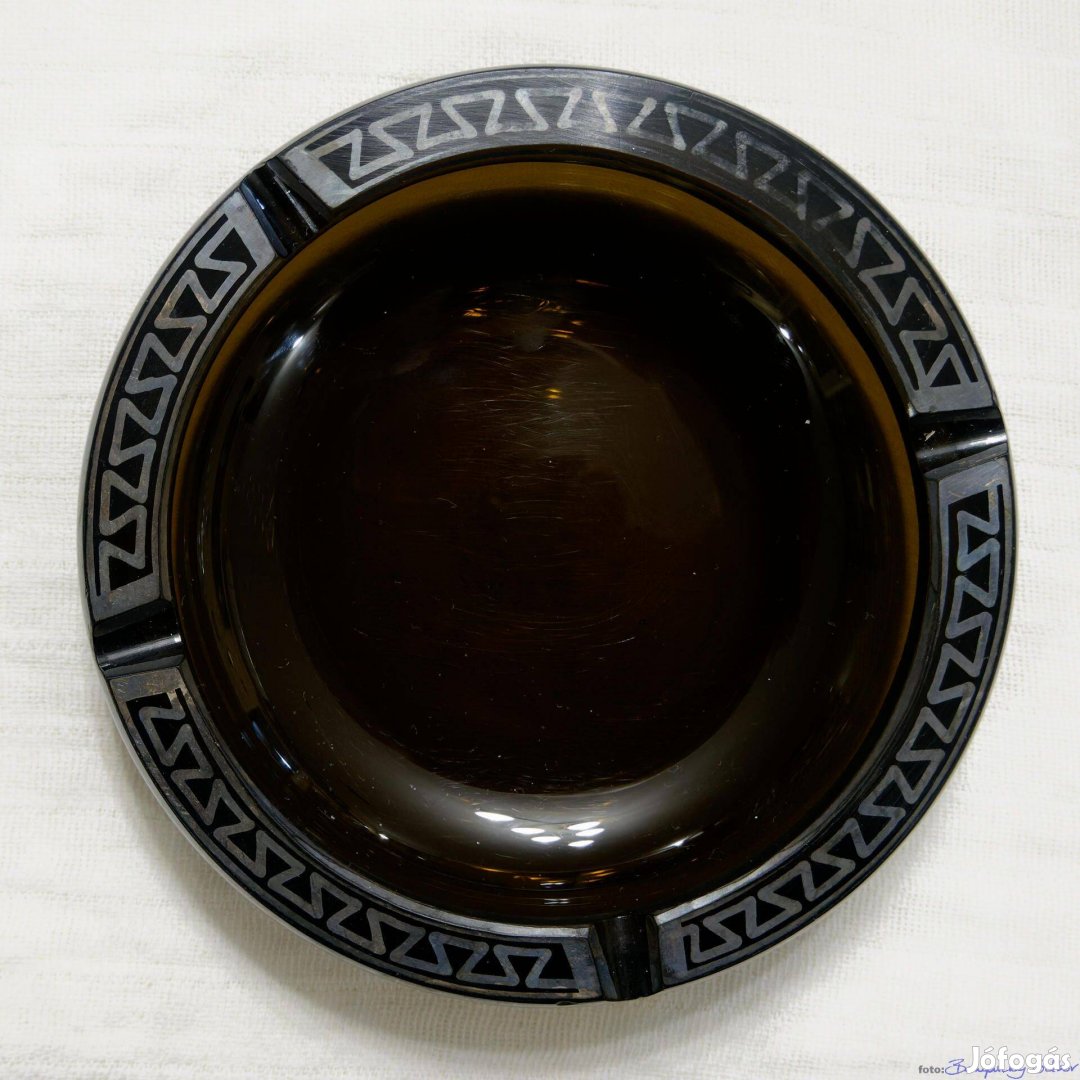 Sötét, borostyánszínű (sötét-barna) üveg hamutartó, ezüst színű geometrikus meander díszítéssel a peremén. Négy cigarettatartó mélyedés található a peremen.