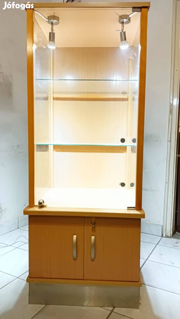 Méret 60 x 60 x 152 cm, 2 db kivehető polccal, világítással, tölgy szín bútorlapból és üvegből készült, üzletbe, kirakatba, kiállító térbe, ékszernek, kiállítási tárgyaknak, akár elektromos berendezésekhez is, minden polchoz plusz hátsó nyílások kábelbevezetéshez. Használt, jó állapotú, egy darabban szállítható, elszállítás vevő feladata.