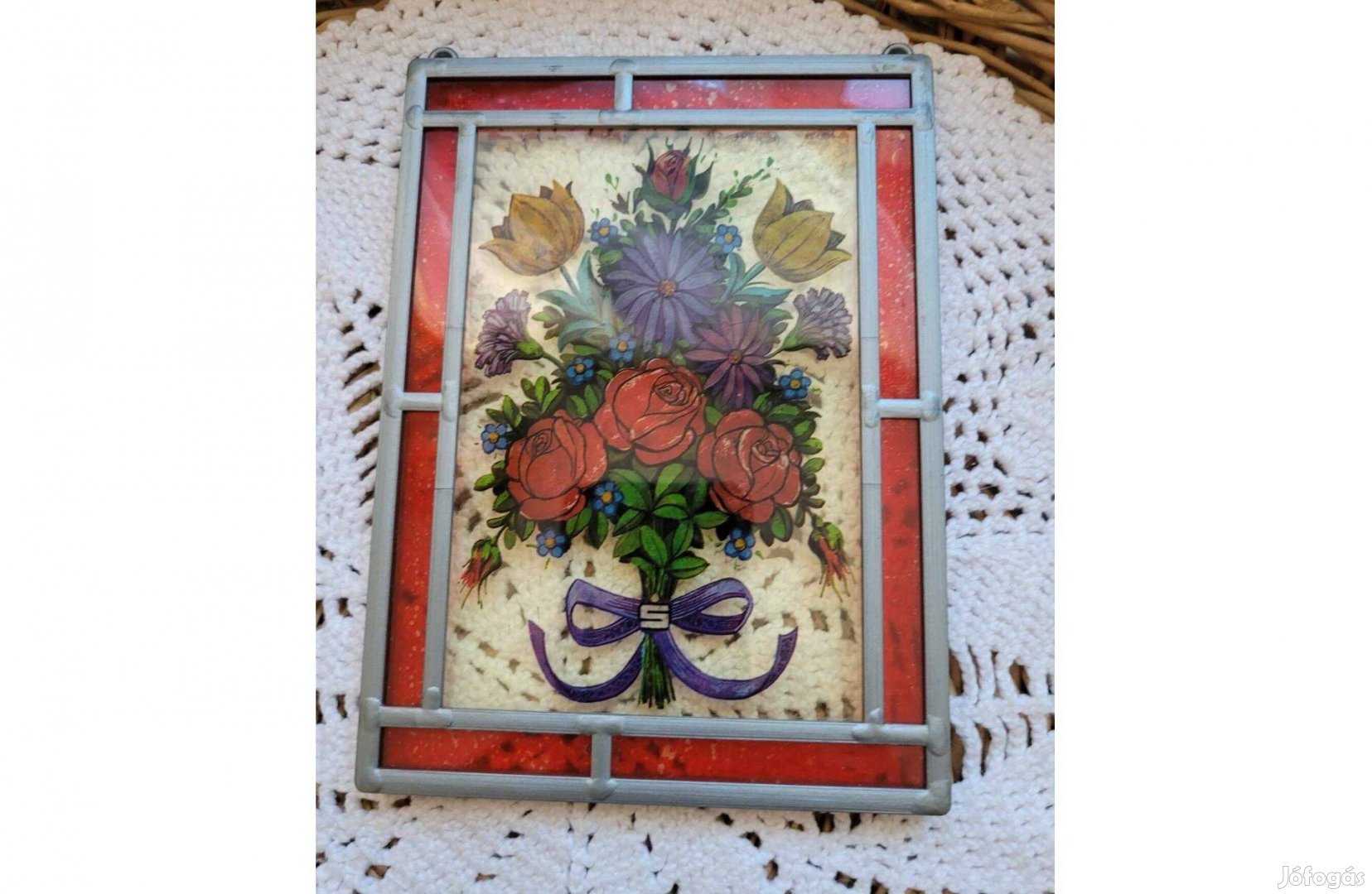 Eladásra kínálom a képen szereplő üveglapra festett csendélet -ablakdíszt. Körbe fotóztam. Szép állapotban. Ón keret hatású műanyag keretben.