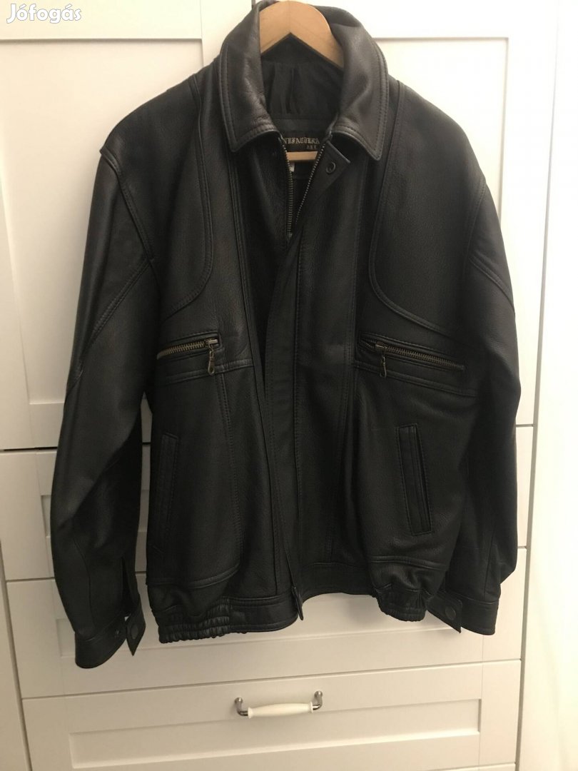 Sohasem hordott, egyedi olasz minta alapján gyártott fekete, férfi bőr dzseki, 54-es méretben