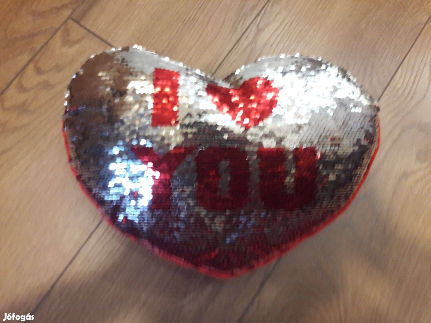 Eladó egy Valentin napi flitteres díszpárna, átfordítható kétszínű mintával.