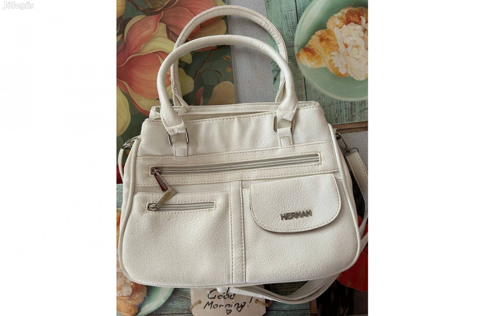 Kiváló állapotú nem használt fehér Hernan női kézi- és válltáska. Három cipzáras főrekesze van, a tartalma így könnyen rendszerezhető. Méretei: szélesség 30 cm. magasság 24 cm.