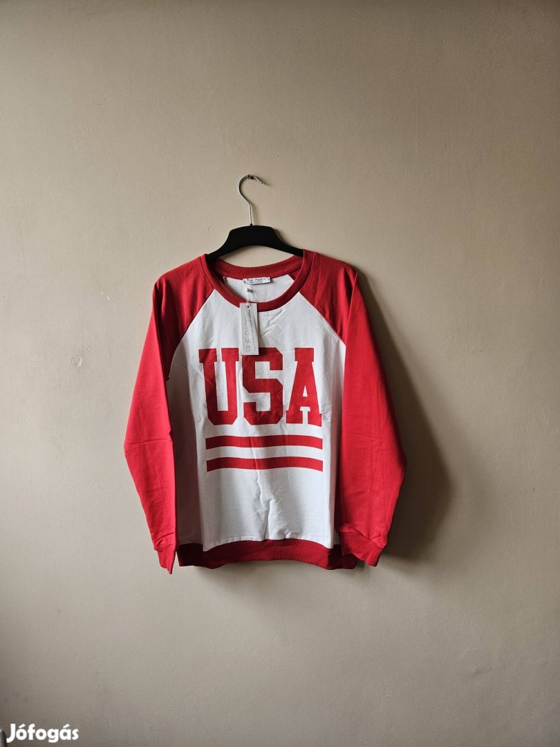 Fehér pulóver piros ujjal, nyakkal és USA felirattal. Vékonyabb anyagból, hosszú ujjal, kerek nyakkal, alján-nyakán-ujján bordás passzéval.