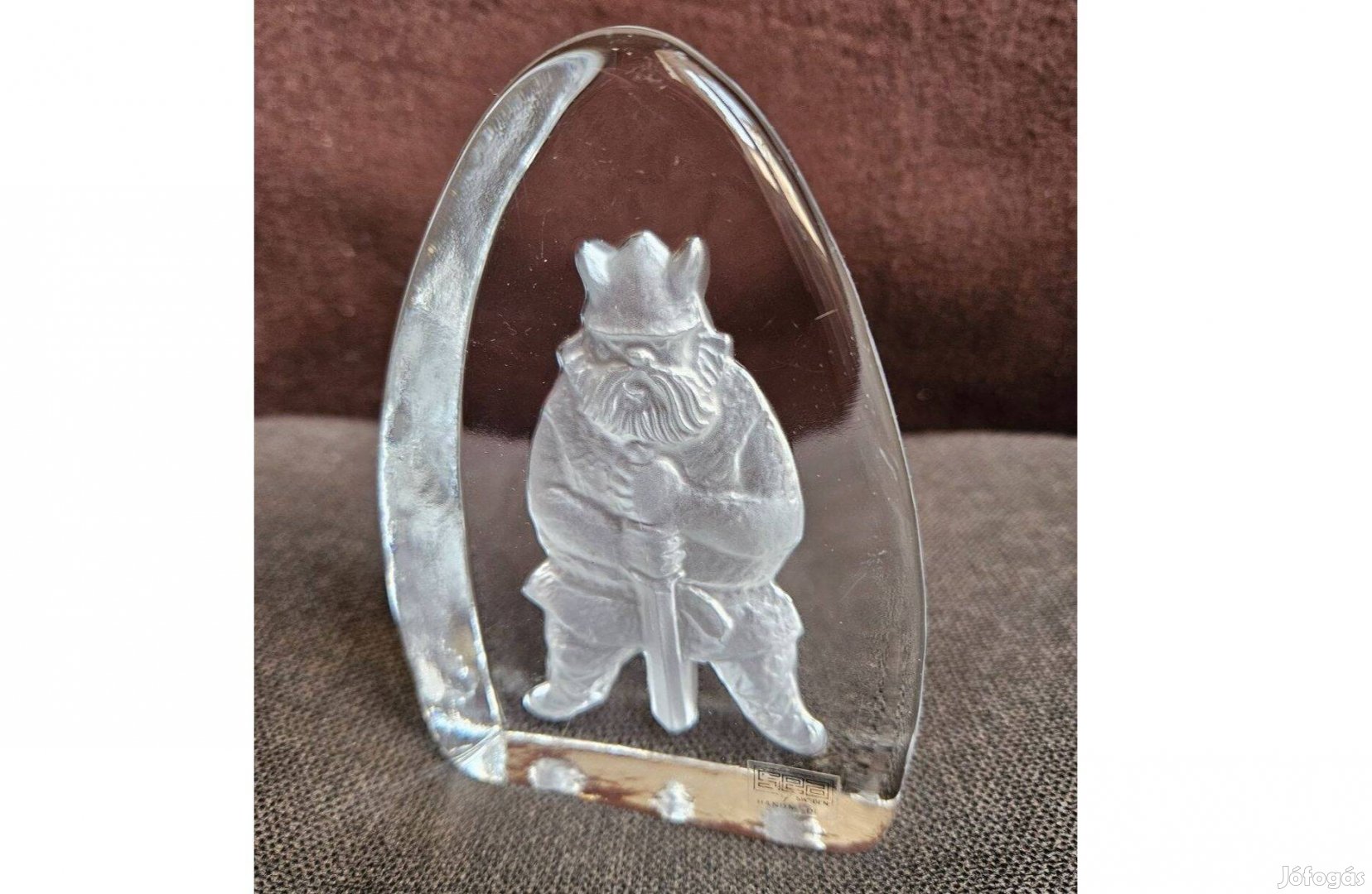 Skandináv kristály üvegböl készült vikinget ábrázoló levelnehezék, álló dísztárgy.