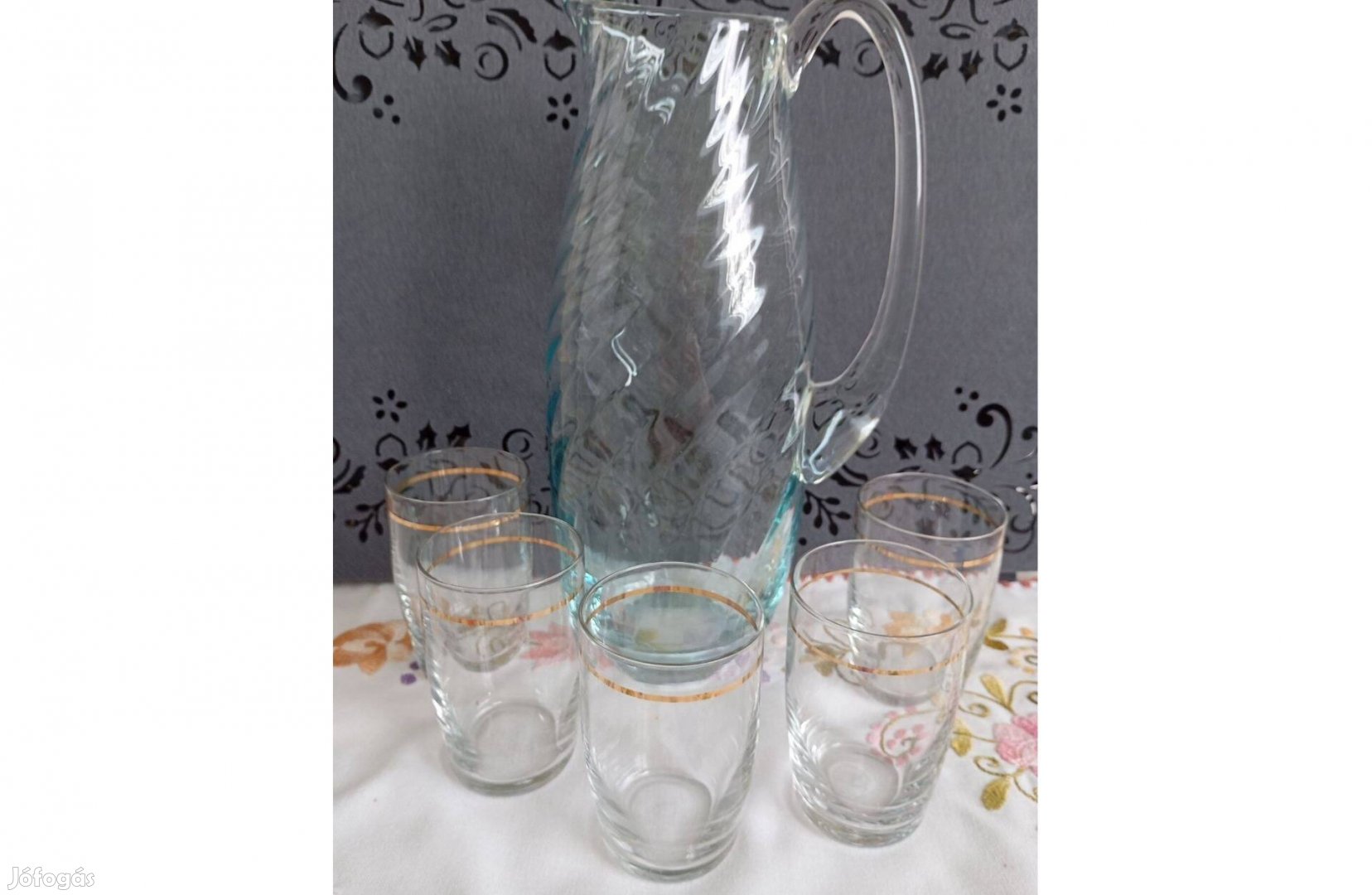 Vastag üveg kancsó 5 db boros pohárral eladó.