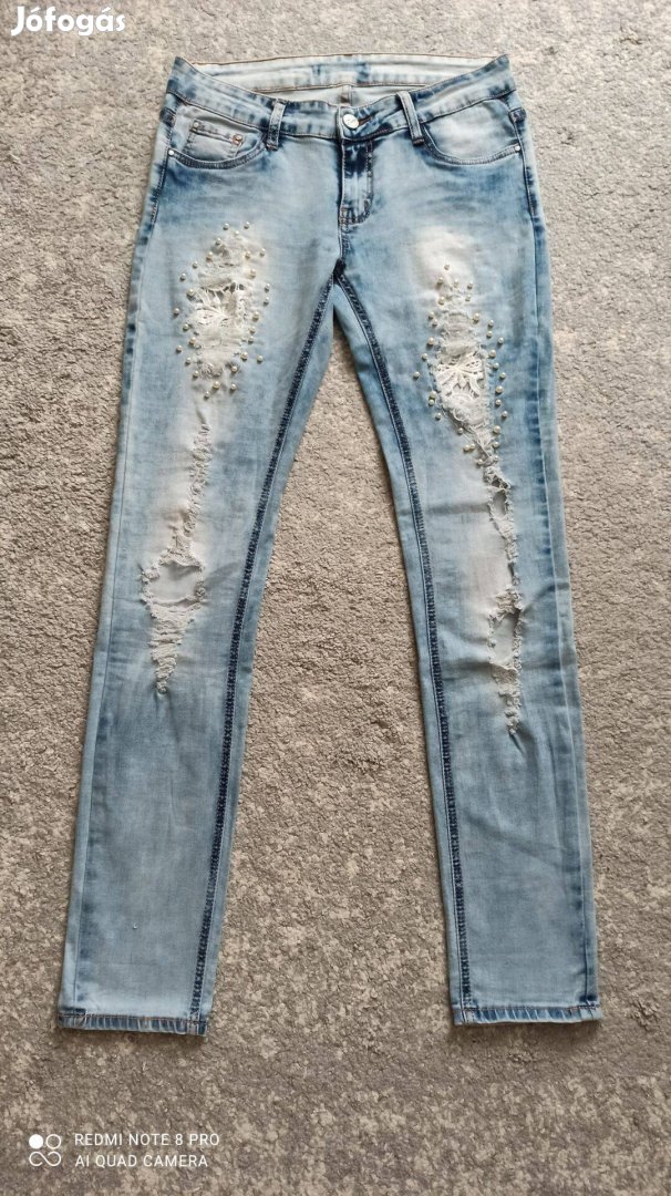Világoskék sztreccses gyöngyökkel díszített szaggatott, csipkebetétes farmer L-es méretű új állapotú 4500 Ft-ért eladó.