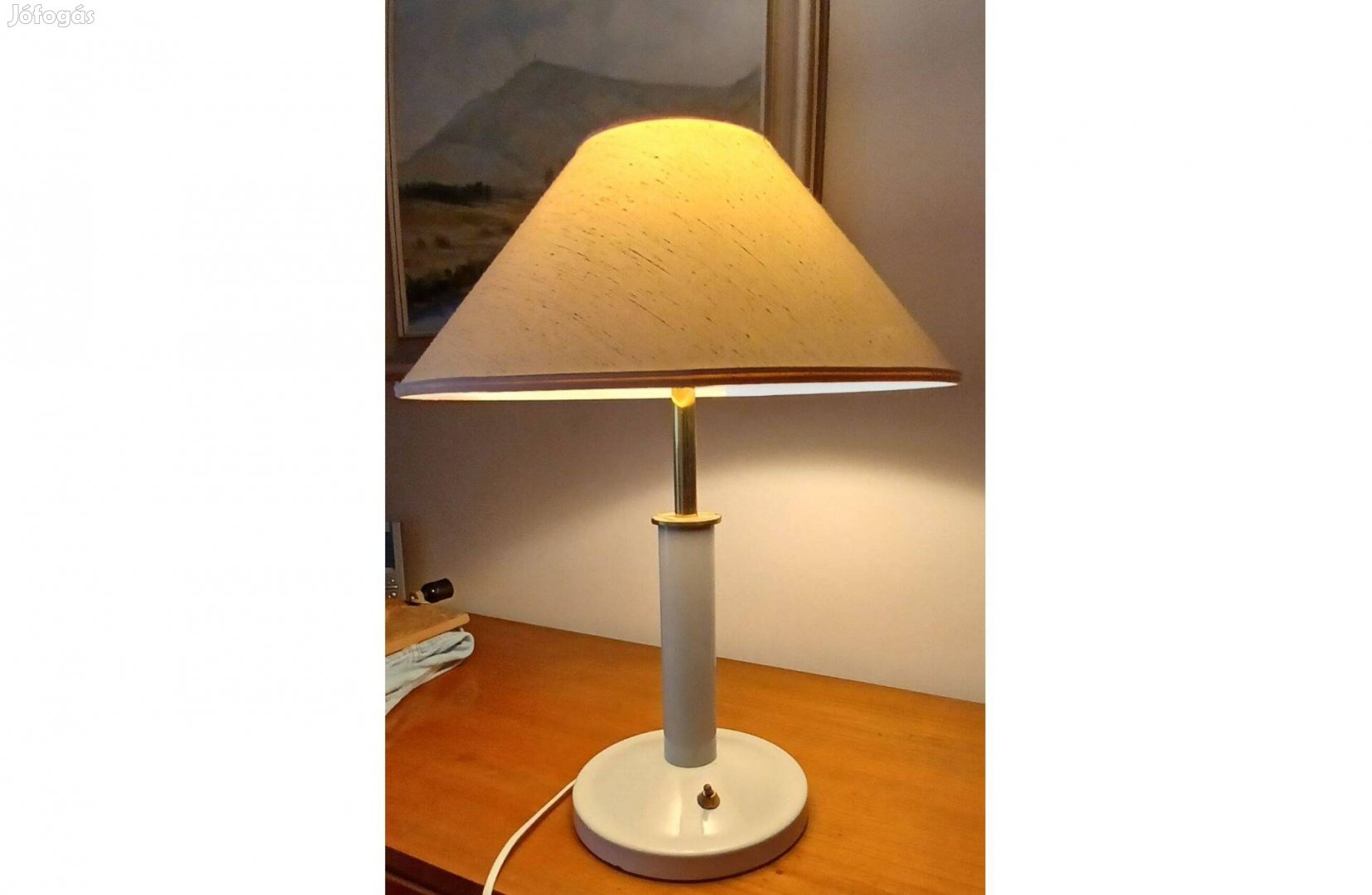 Fehér és arany színben, fém talp, réz kapcsoló, textil ernyő.