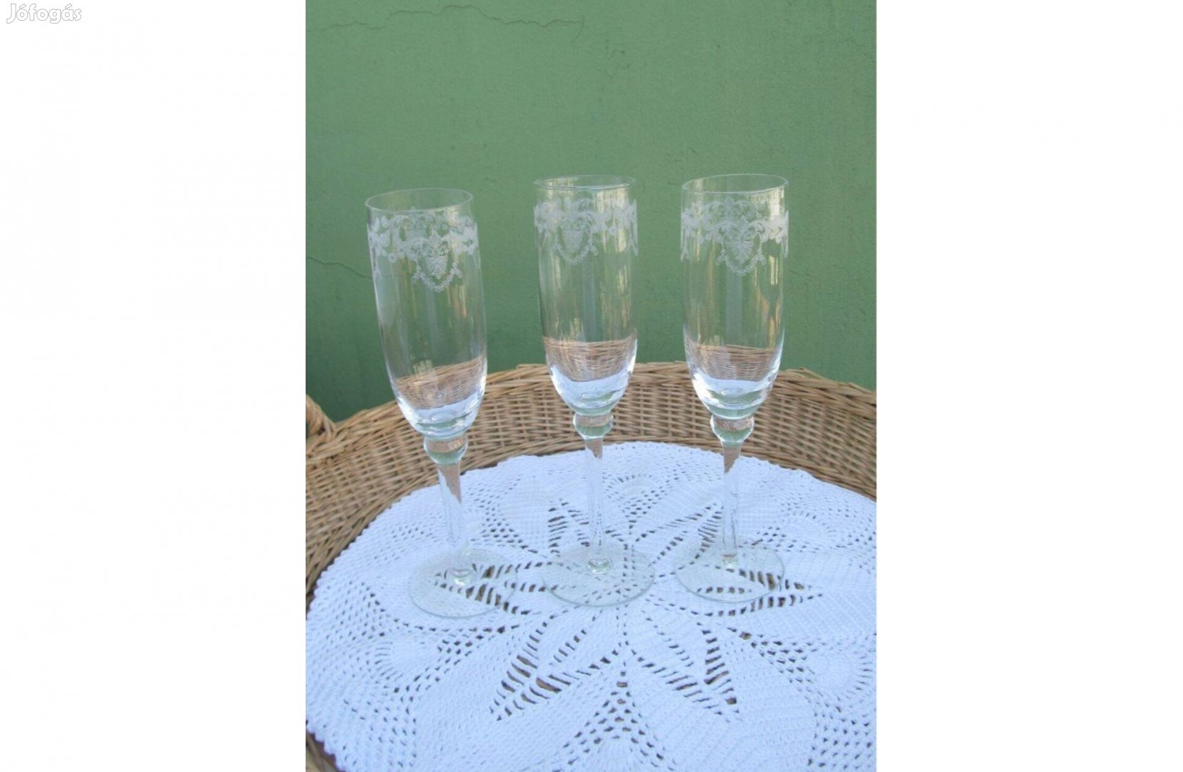 Eladásra kínálom a képen szereplő szépséges, homokfúvott, pezsgős kelyheket.. A képek magukért beszélnek. Körbe fotóztam. Szép, különleges, hibátlan 3 db