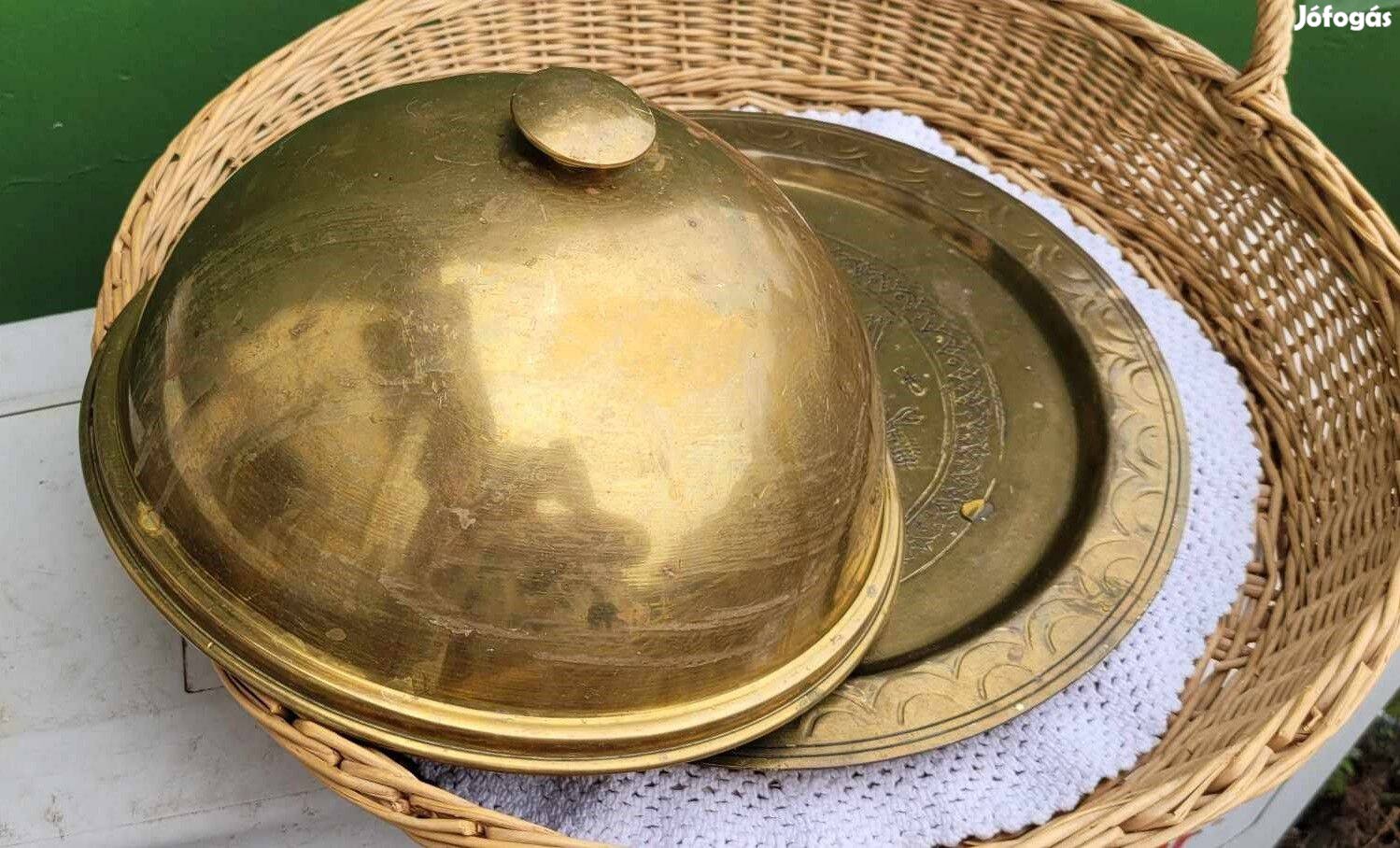 Eladásra kínálom a képen szereplő vintage réz sajt búrát és tálcát. A képek magukért beszélnek. Körbe fotóztam. Szép, használható állapotban, korából adódó elszíneződések, hibák, fotón látszik. Mágnes egyiket sem fogja. A tálcán szép minta és jelenet. A búra nem passzol rá, csak össze tették, külön is elvihetők.