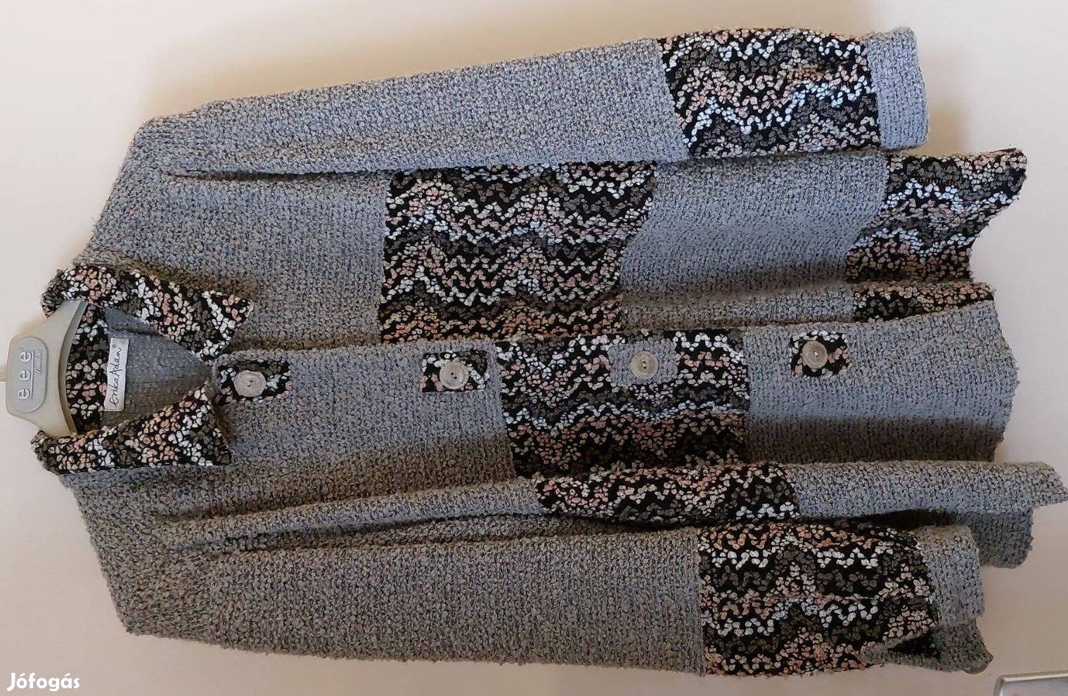Eladó a képen látható Erika Adam márkájú szürke-fekete-púder színű bouclé anyagú női kardigán.