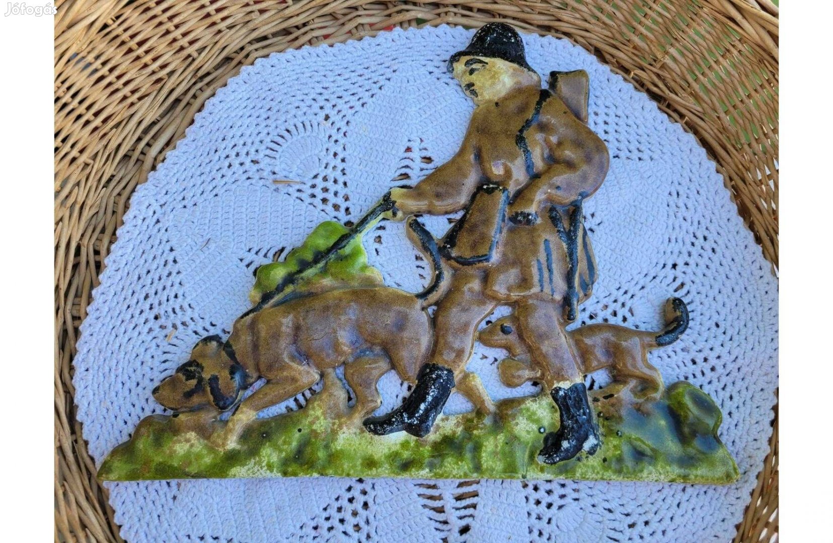 Vintage zománcos, öntöttvas, vadászjelenetes falikép