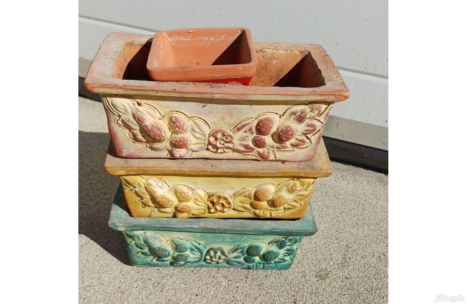 3 db különböző színű kisméretű dekorációs mázas retro cserép virágtartók, kaspók eladóak. Méret 20 cm hosszú, 10 cm széles és 7 cm magas. Darab ár: 1100
