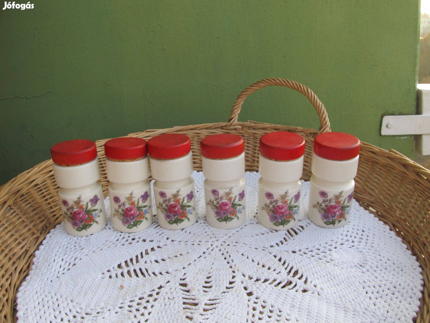 Eladásra kínálom a képen szereplő virágcsokor mintás porcelán kis fűszertartókat.. A képek magukért beszélnek. Körbe fotóztam. Ez a 6 db van. A tetők fa és parafa. Különleges, ritka darabok.