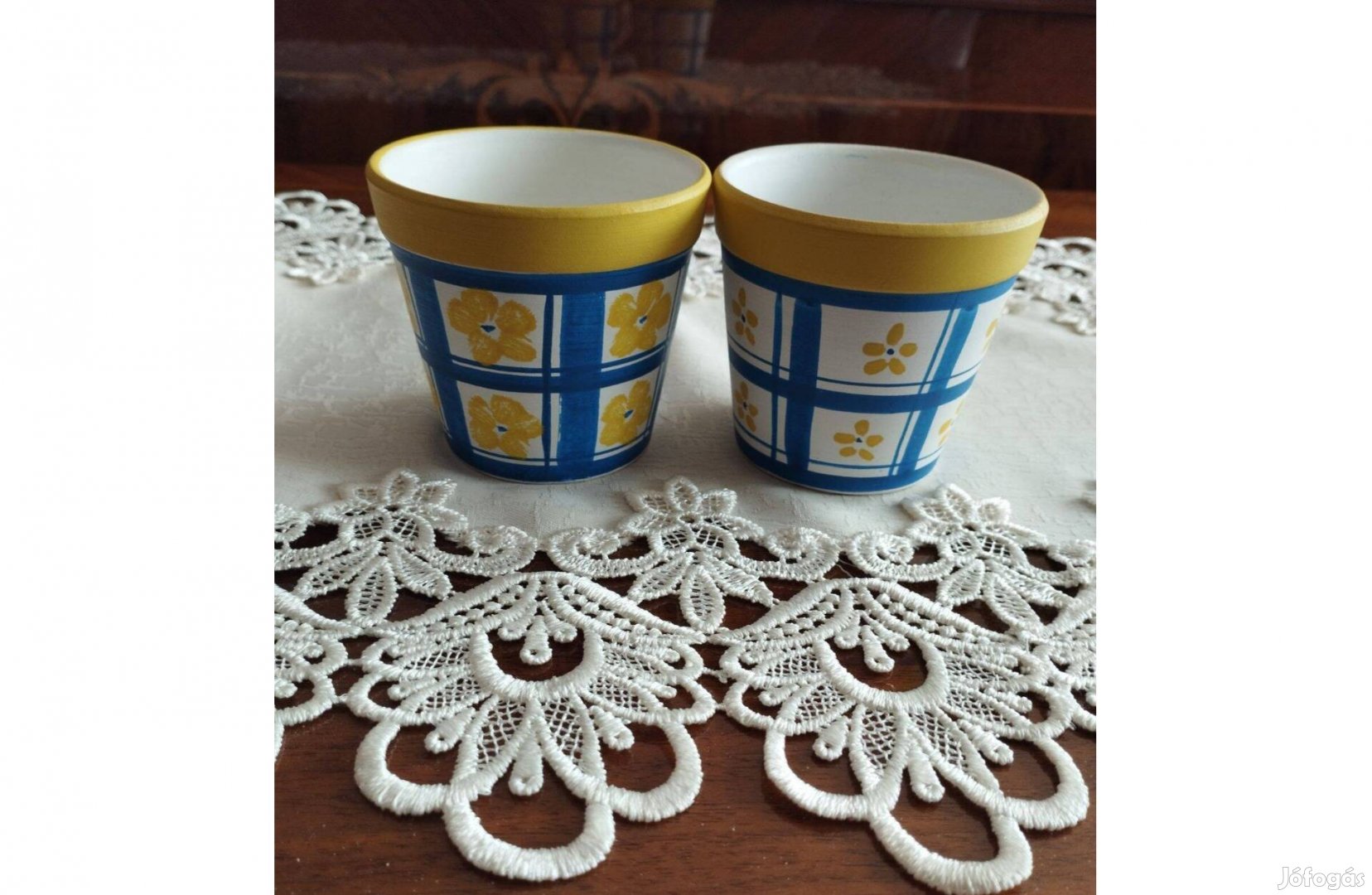 Új, kiváló állapotban lévő kaspó szobanövényeknek vagy balkonra virágcserépnek alkalmas, vidám virágtartó eladó. Két egyforma, virággal díszített kaspó egyben vihető.