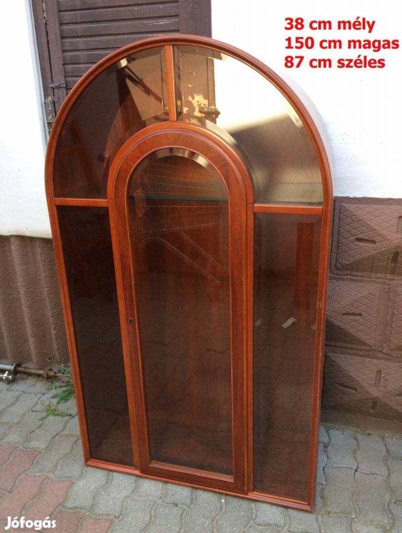 Üveges vitrin: 38 cm mély, 150 cm magas, 87 cm széles.
