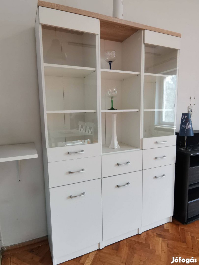 Három részből áll , a két szélsőn felül üvegajtók , középen nyitott, 2-2-2 polc, alatta fiók, alsó polcos részén MDF ajtó.