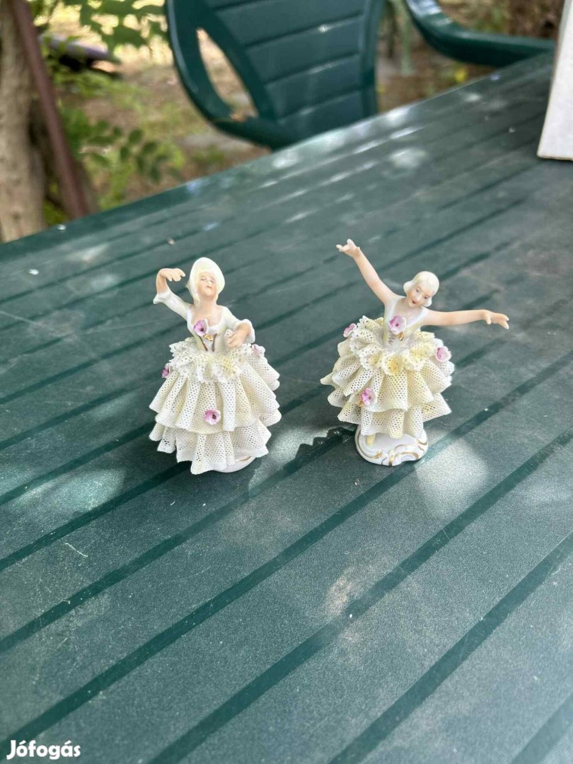 Eladó egy elegáns porcelán táncosnő figura pár, csipkeporcelán technikával készült kivitelben.