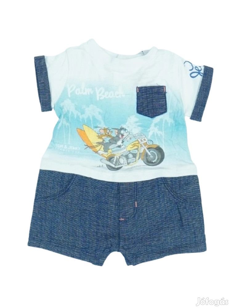 Kisfiú napozó, amely egy világoskék színátmenetes pólórészből és kék farmerhatású rövidnadrágból áll. A póló elején 'Palm Beach' felirat és Tom és Jerry mesefigurák láthatók motoros szörfdeszkával, pálmafákkal a háttérben. A póló ujjai és mellzsebe farmerkék színű anyagból készült, hátán patentos záródással. A rövidnadrág farmer megjelenésű, kényelmes gumis derékkal. Ideális választás aktív kisfiúk számára meleg időjárásra.