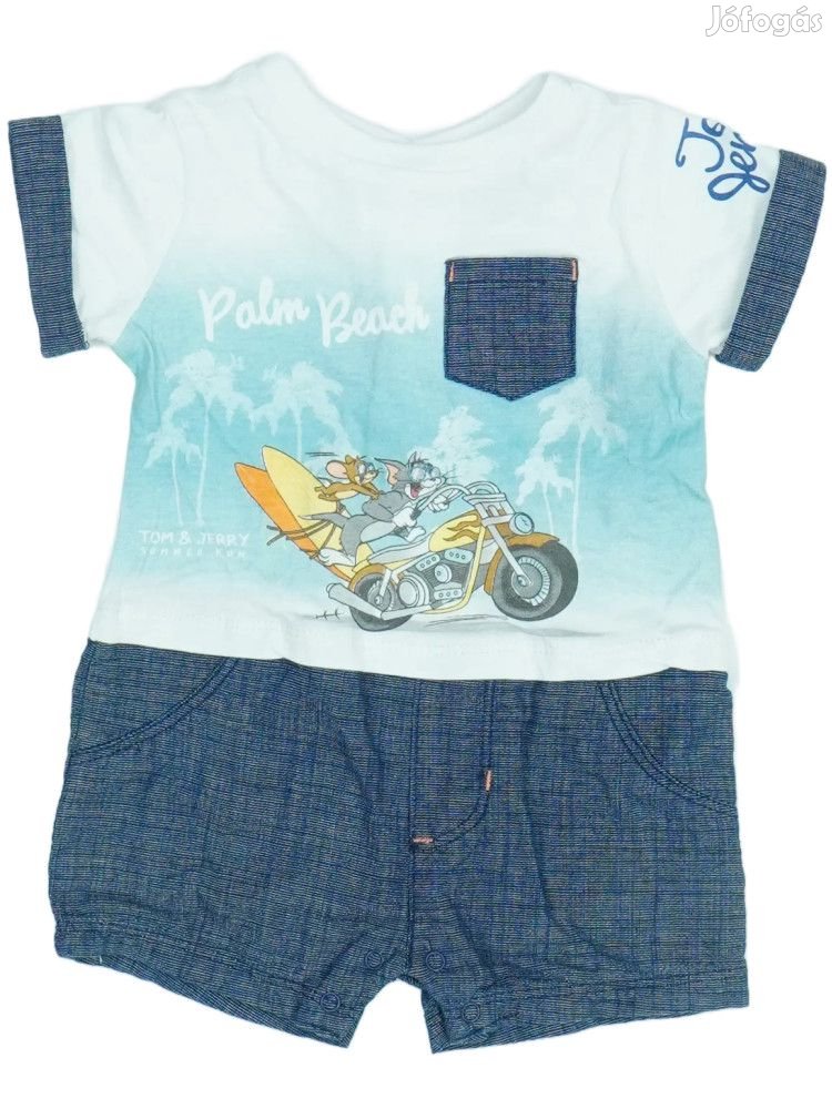 Kisfiú napozó, amely egy világoskék színátmenetes pólórészből és kék farmerhatású rövidnadrágból áll. A póló elején 'Palm Beach' felirat és Tom és Jerry mesefigurák láthatók motoros szörfdeszkával, pálmafákkal a háttérben. A póló ujjai és mellzsebe farmerkék színű anyagból készült, hátán patentos záródással. A rövidnadrág farmer megjelenésű, kényelmes gumis derékkal. Ideális választás aktív kisfiúk számára meleg időjárásra.