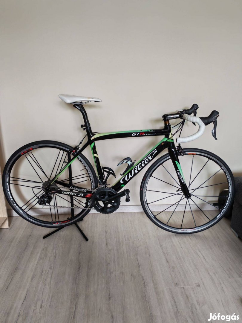 A kerékpáron Ultegra 6800-as váltó szett , 105-s hajtómű, FSA Wilier fékek, K-Force carbon nyeregcső, Champagne Eurus kerekek. A váz carbon M-es méret 52*52. Look pedál.2*11 -es váltó.