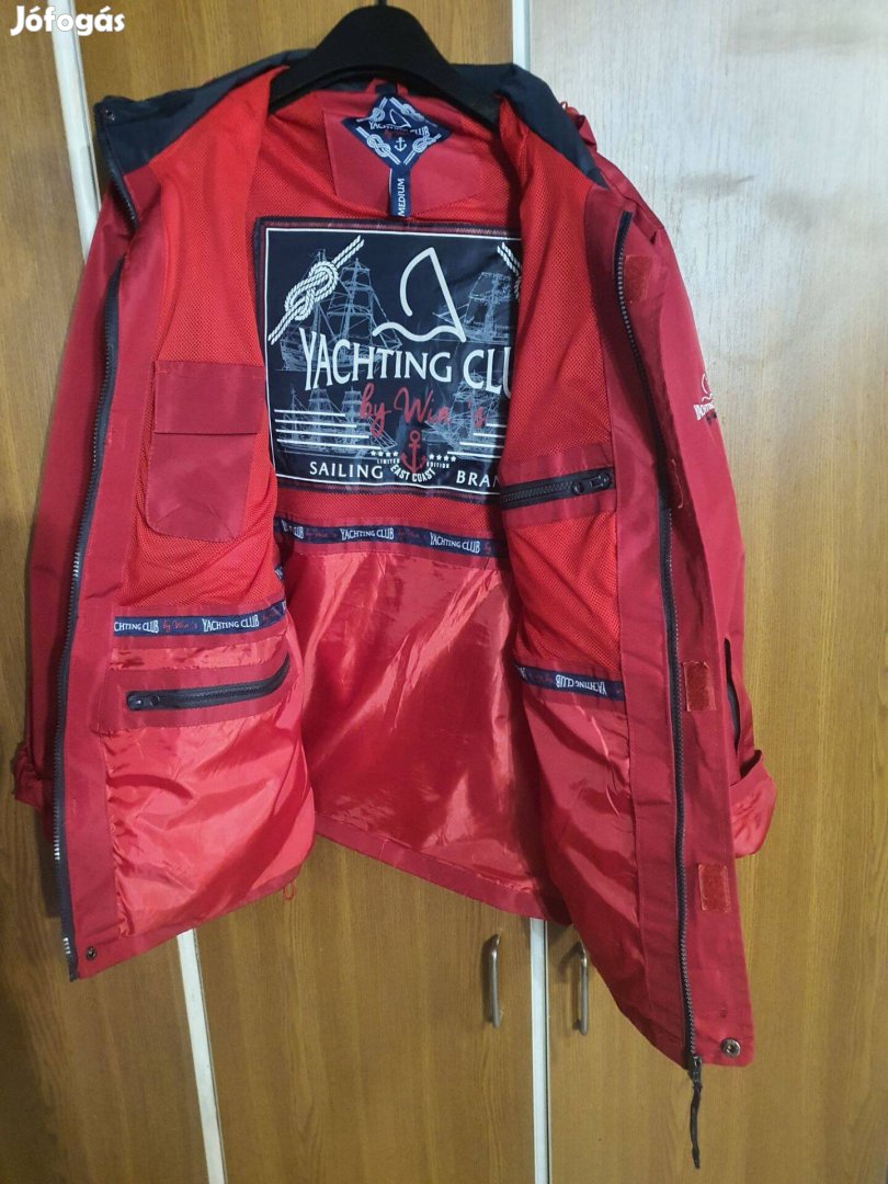 Yachting Club sportdzseki, S méret. Piros. Újszerű. Cipzáras kapucni. Hossz 73 cm. Vállbőség 46 cm. Derékbőség 57 cm. Két nagy cipzáras belső zseb és egy kis telefontartó zseb. Két nagy külső zseb patenttal.