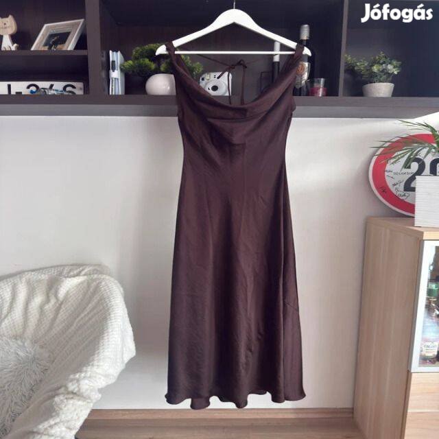 A híres Zara márka elegáns, mély csokoládébarna színű midi ruhája. A modell fényűző megjelenését a nemes csillogású szatén anyagnak és a finom nyakörv (vízesés) kivágásnak köszönheti, amely szépen kiemeli a dekoltázs vonalát.