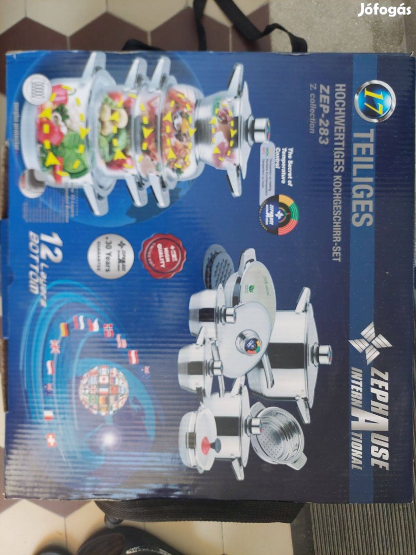 Dobozában van. Nem használt. Serpenyő és két kisebb lábas hiányzik