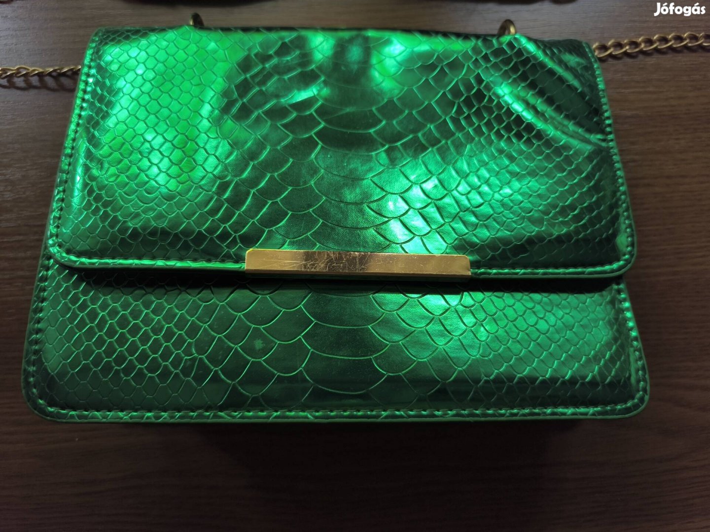 Új, sosem hordott, metál zöld, fém láncos Shein oldaltáska. Belseje fekete anyaggal bélelt.