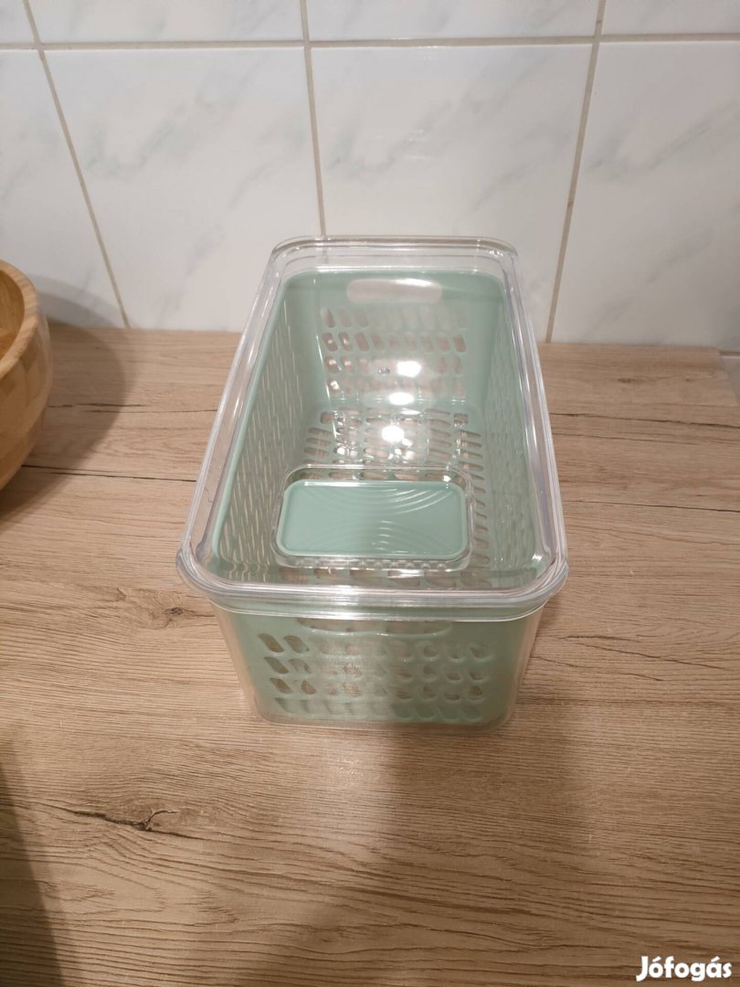 Új, nem használt zöldség és gyümölcs tároló doboz, műanyag, szellőző nyílással, kivehető kosárral. Átvehető személyesen a XI. Kerületben vagy postázni is tudom.