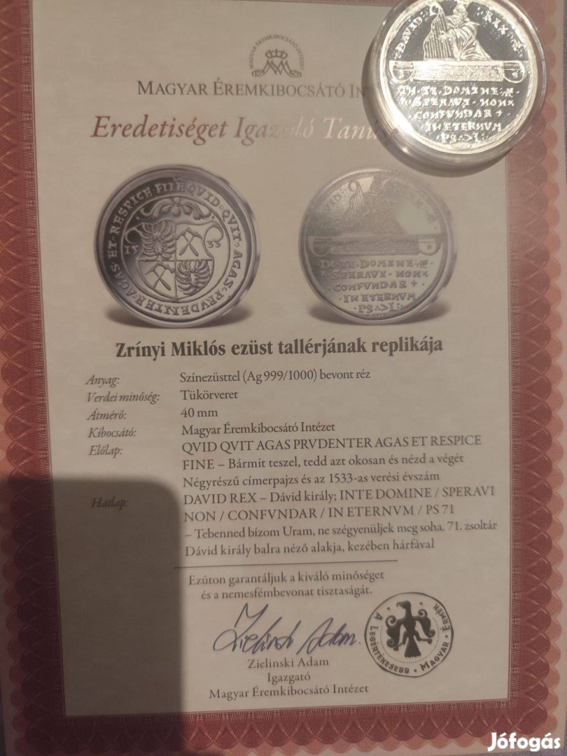 Eladó 2 db történelmi ezüst tallér replika, eredetiséget igazoló tanúsítvánnyal: