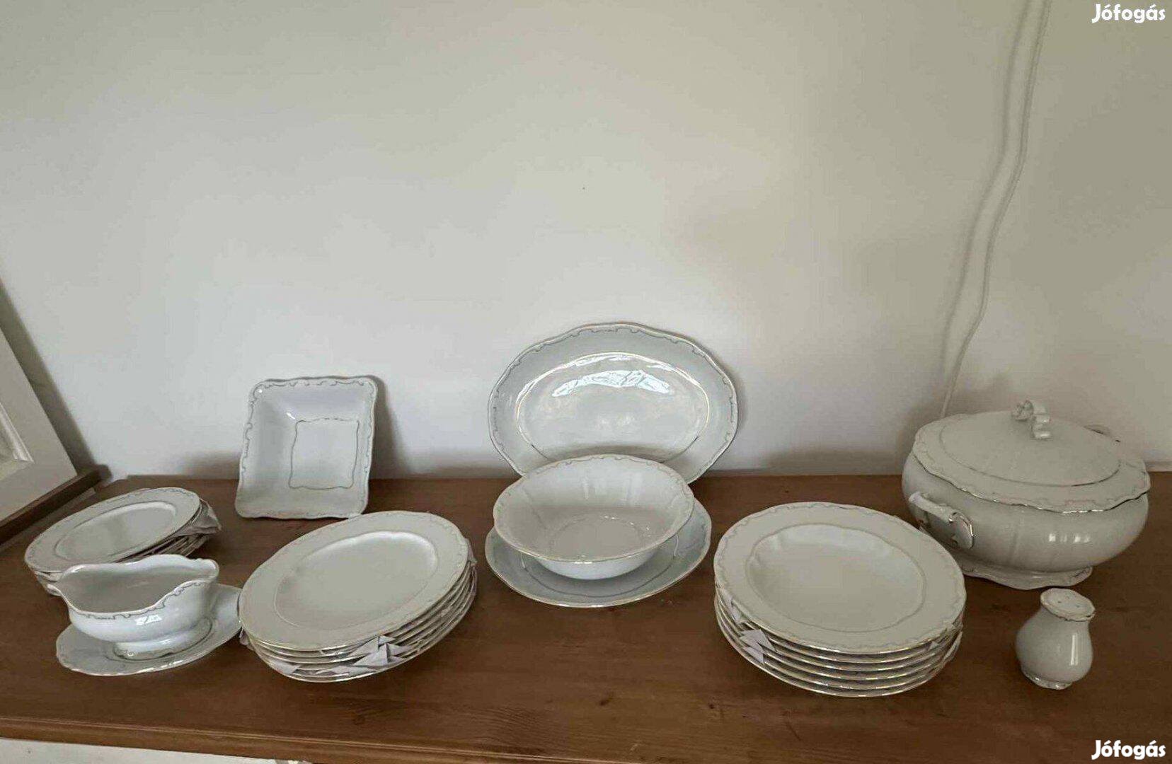 Eladó egy teljesen új, nem használt Zsolnay Aranytoll vacsoraszerviz, 25 darabos étkészlet, 18 karátos arany díszítéssel. Kihasználatlanság miatt eladó a szett. Eddig biztonságos helyen, megóvva tároltuk, tehát karc és sérülésmentes. A fotózás kedvéért bontottam ki egyáltalán a csomagolásából. Nem szívesen postázom, nagy súlyú és törékeny. Az étkészlet tartalma: