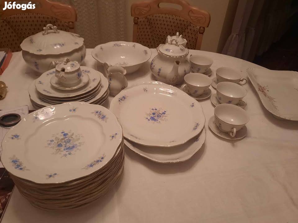 Eredeti számozott Zsolnay étkészlet, aranyozott széllel és kék virágos mintákkal, annyi darabból áll, amennyi látható a fényképeken. 11 db lapos tányér, 4 db mély tányér, 4 db kis tányér, 5 db teás csésze a hozzá tartozó tányérral.