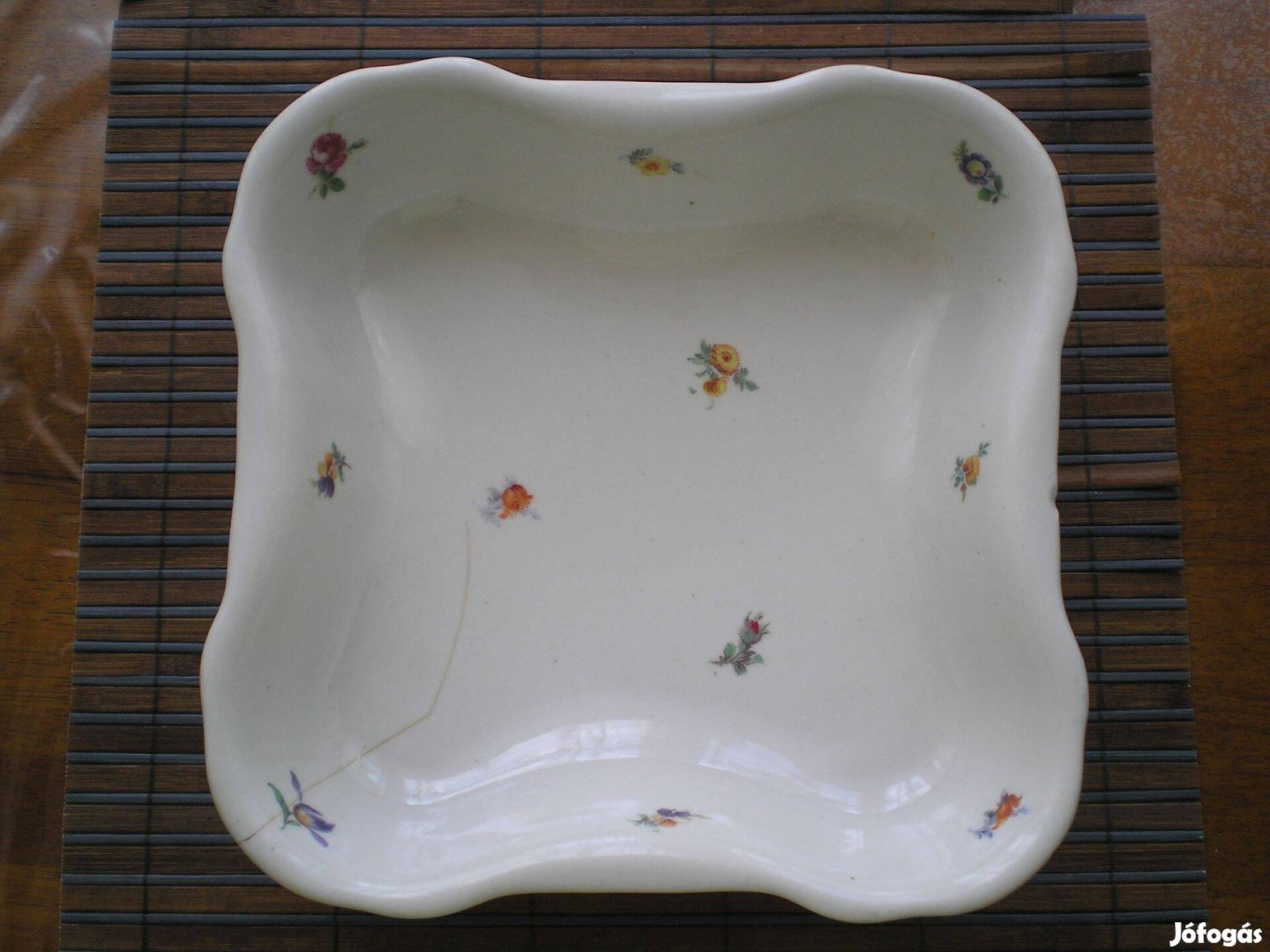 Az egyik sarkában repedés van, de nem szivárog és van egy pici leütődés a szélén. Egyébként nagyon szép darab, finom apró virágokkal díszítve.
