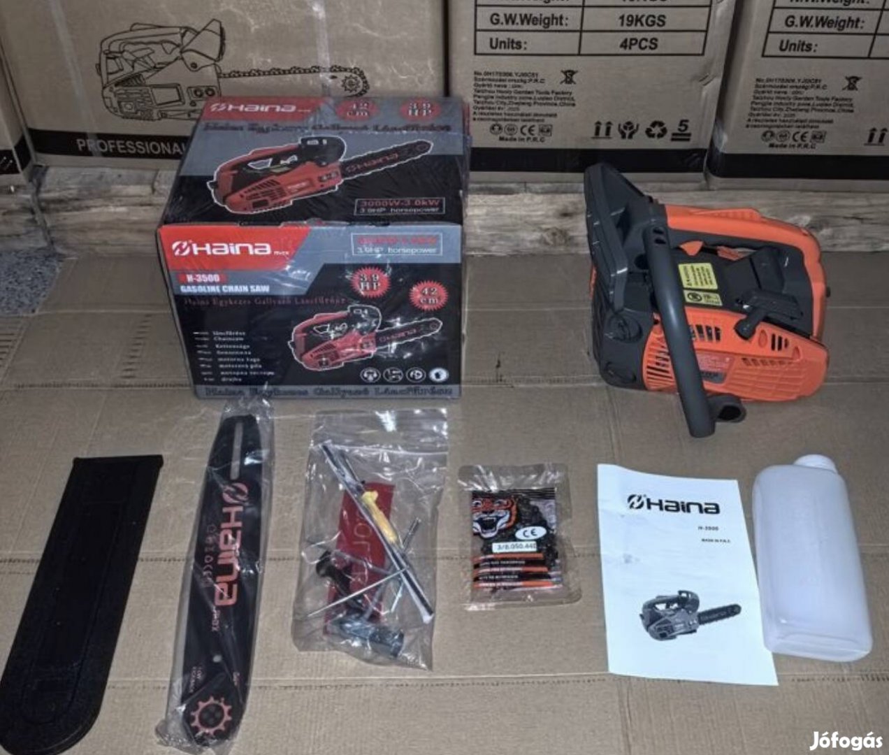 Haina Benzinmotoros Gallyazó Mini Láncfűrész 3,9 Lóerős 42ccm 30cm vágáshossz 3,2kg tömege Teljesen új, bontatlan dobozban Praktikus.