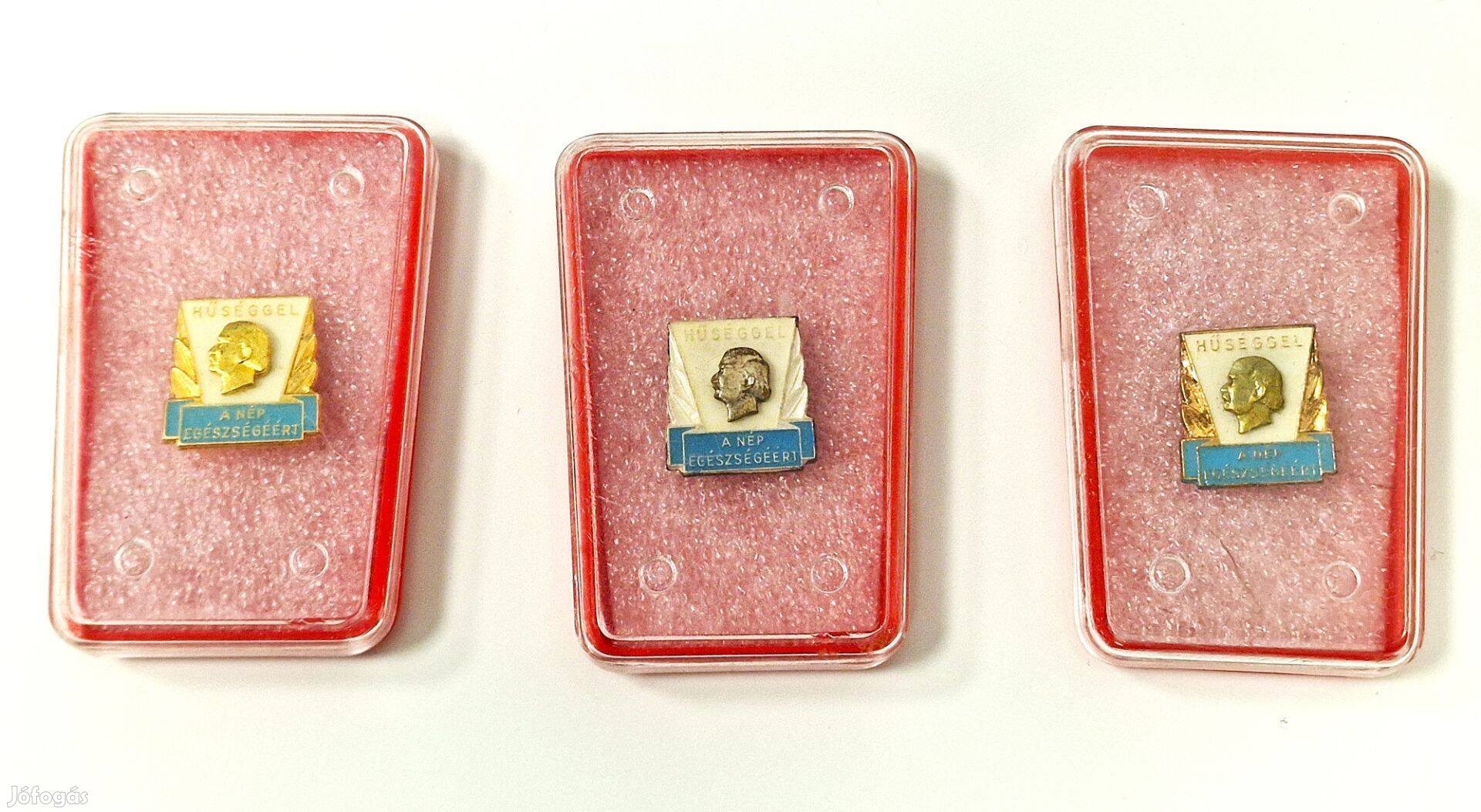 "Hűséggel a nép egészségéért" arany, ezüst, bronz fokozatú jelvények eredeti dobozukban egyben eladók a megjelölt áron. Postázás vevő terhére megoldható.