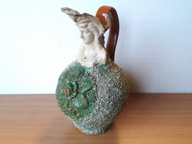 Antik kézzel festett kétfüles zöld mázas kerámia korsó