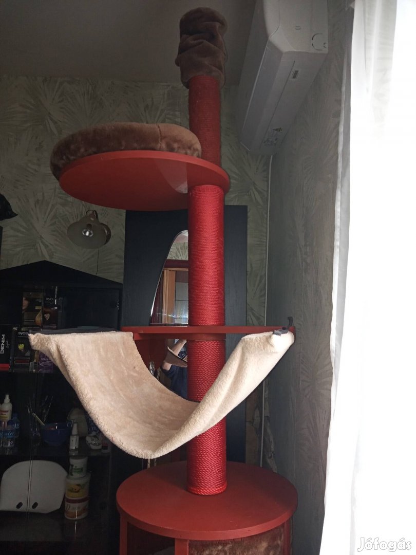 Eladó a képeken látható egyedi macska cica kaparófa. 250-270cm magasságig plafonig állítható. Bélelt mosható huzat. Egy házikó 3 pihenő. Több kedvenc cicának is javasolt. Csak személyes kispesti átvétel. Szállításban nem tudok segíteni. Csak szét szerelt állapotban vihető.