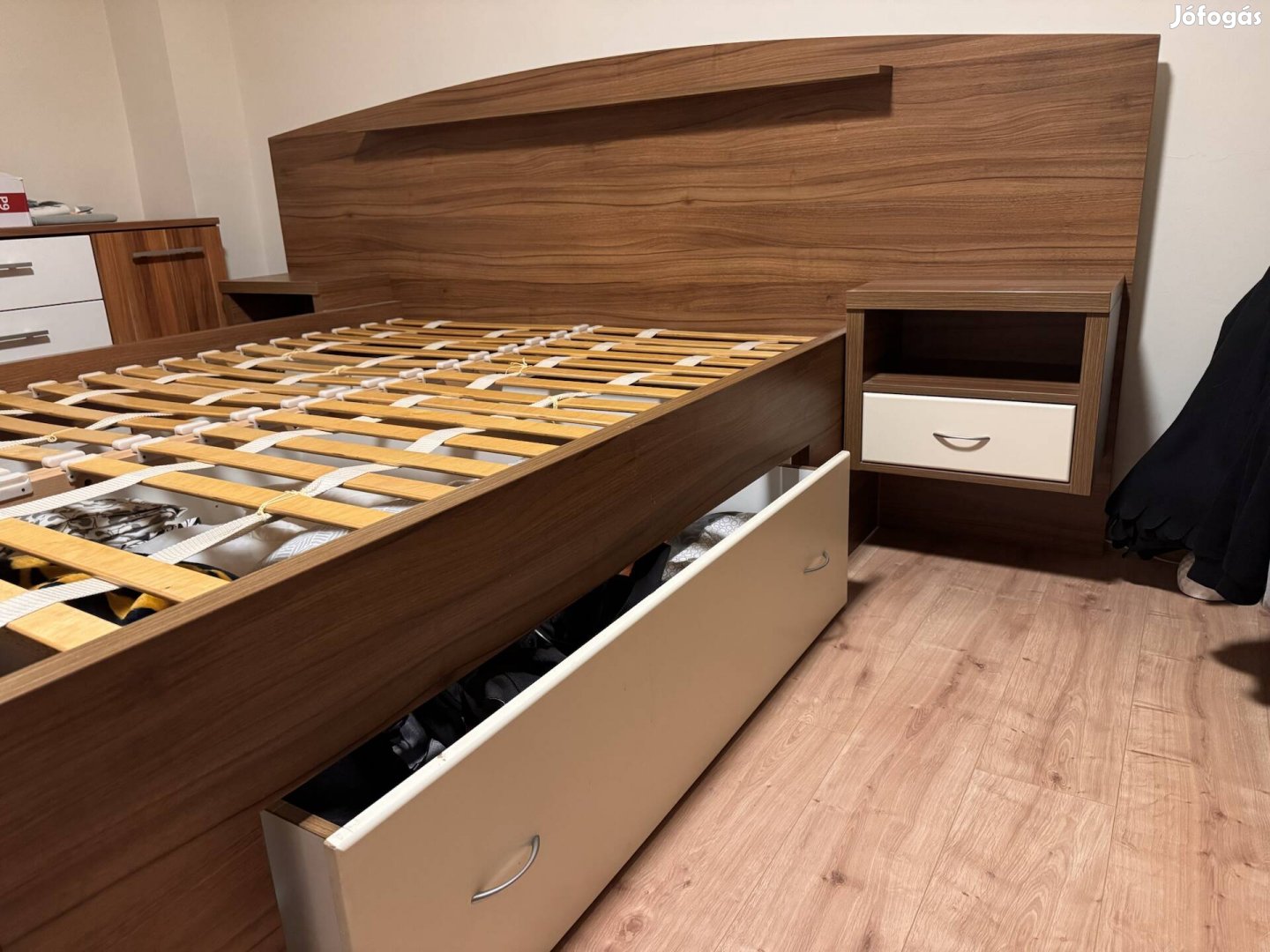 Minőségi anyagokból készült egyedi gyártású ágykeret jelképes áron eladó. Fiókos éjjeli szekrényekkel, hatalmas gurulós tárolóval, ágyraccsal. Nagyon masszív szerkezet. Szállításban nem tudok segíteni. Lapra szerelhető.