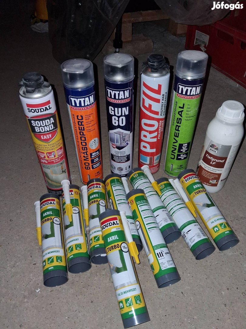 Eladó 9db sudal festhetö akril,1 liter vakolat erösitö mélyalapozo,5db pisztolyos ragasztóés dagadó purhab+1db tüzgátlos