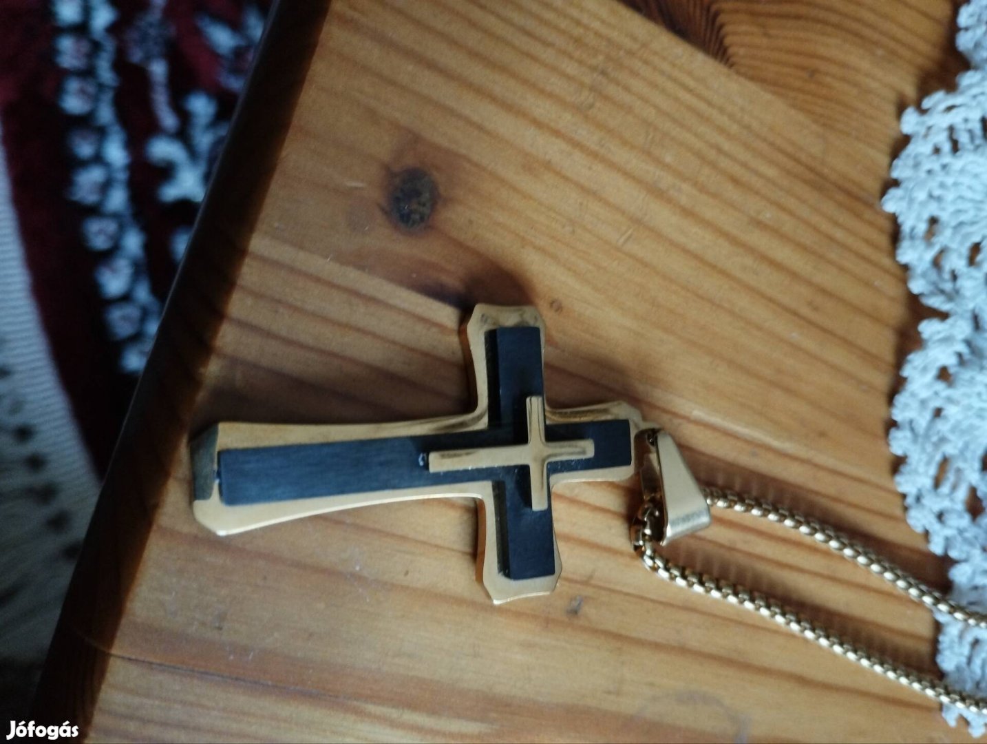Nemesacél, arany színű kereszt medál, lánccal. Kereszt 5 cm, lánc 50 cm. Nem használt.