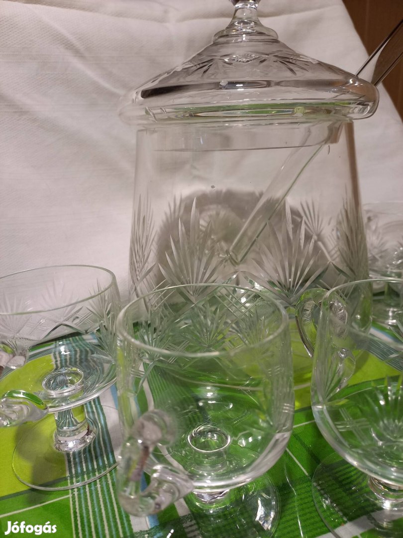 A bólé edény éle kis hibás.A készlet egy adagoló kanalat ,tetőt és 6 db talpas - füles poharat tartalmaz. Személyes átvétel egyeztetés után.
