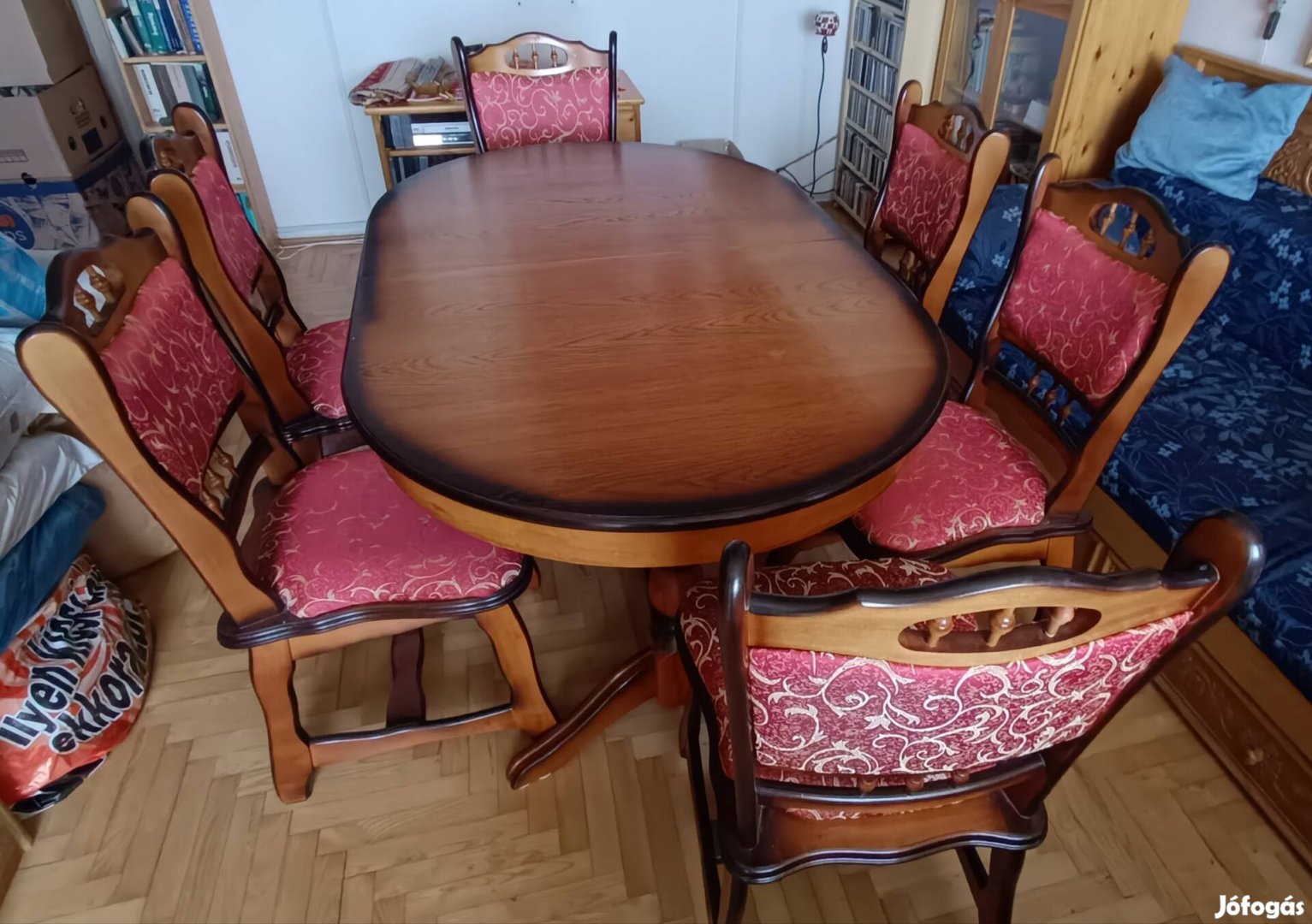 Gyönyörű tömör fa étkezőasztal, bővíthető 8-10 személyesre. 6 bordó kárpitozott székkel. Képeken látható, sértetlen állapotban.
