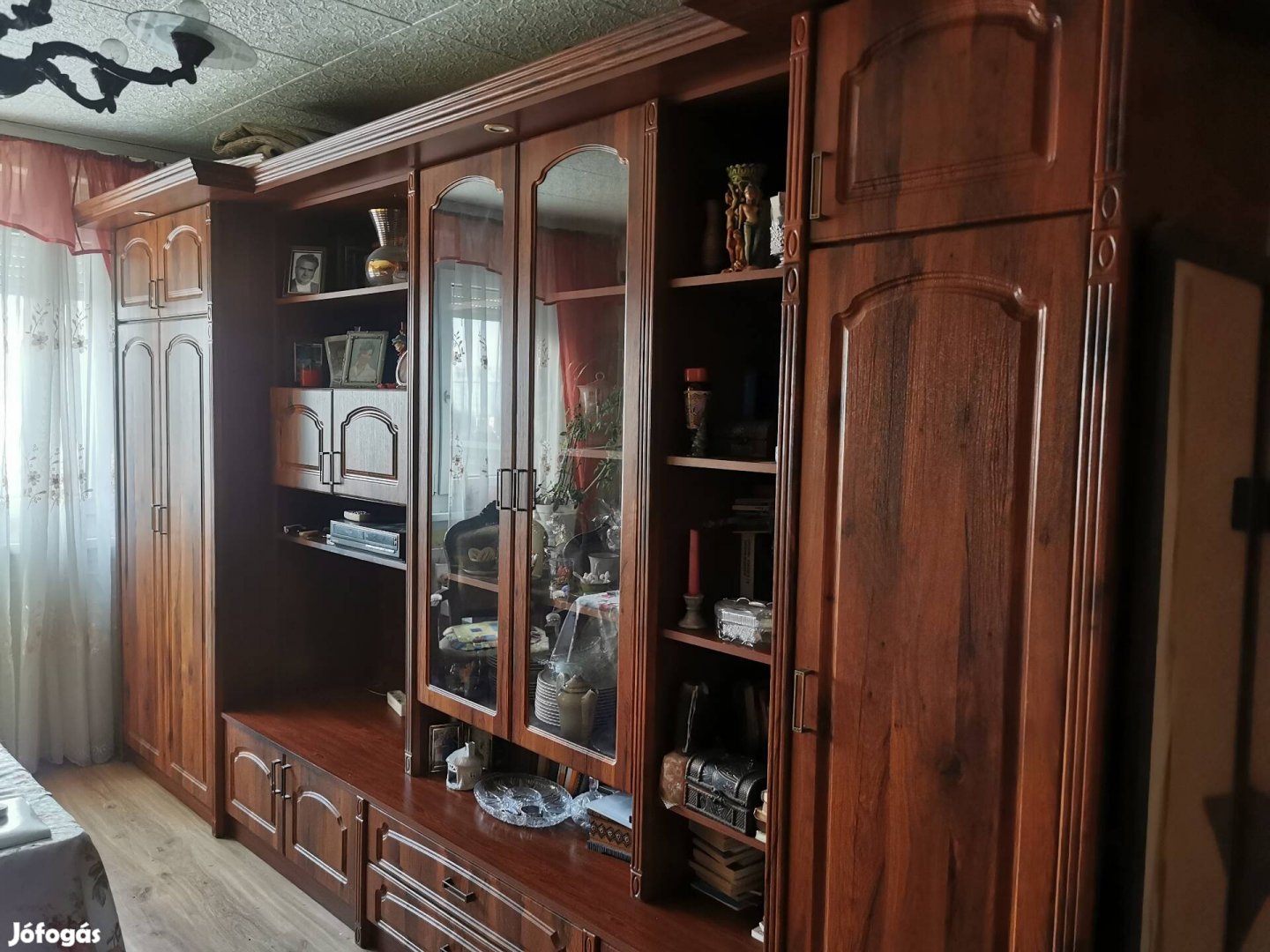Eladó a képen látható nappali bútor. Egyben van de ha a tetejét levesszuk, elemenkent elszallithato. Nem csavarozva van hanem ragasztva így lapra nem szerelhető. Nagyon szép, megkimelt állapotban van, minőségi anyagból. Masszív. Világítással. Magas és mély, sok mindent elnyel, nagyon sok a pakolási lehetőség. Dohanyfüst és kisállat mentes lakásból.