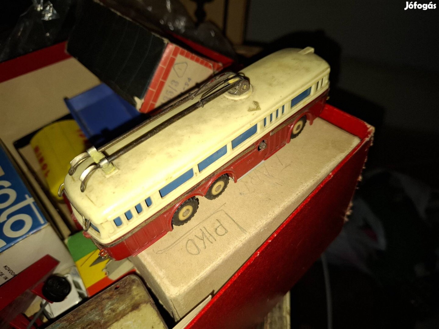Állapot: A képek szerinti [szép / patinás] állapotban, eredeti krémszín-vörös festéssel. A tetején a két áramszedő rúd (troli-pólus) megvan.