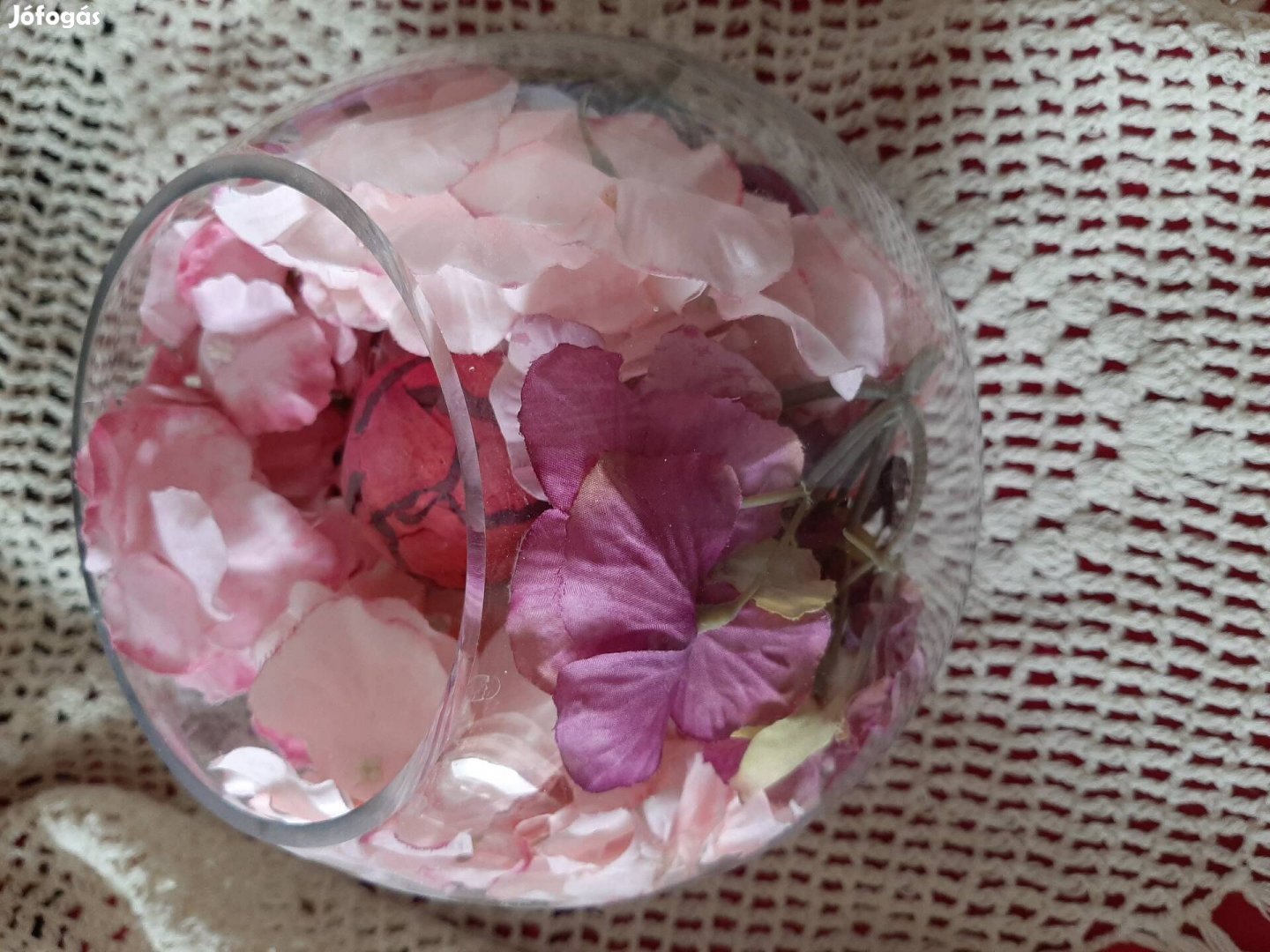 Hibátlan, tökéletes nagy talpas üveg kehely, tele hangulatos művirágokkal (de anélkül is vihető)