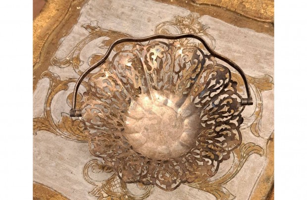 Antik, ezüstözött, áttört, füles kínáló tál vagy kosár