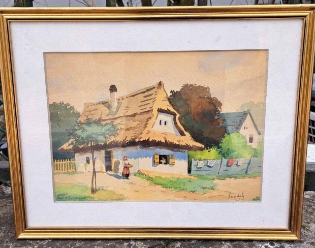 Neogrady Antal: Nádtetős parasztház akvarell,